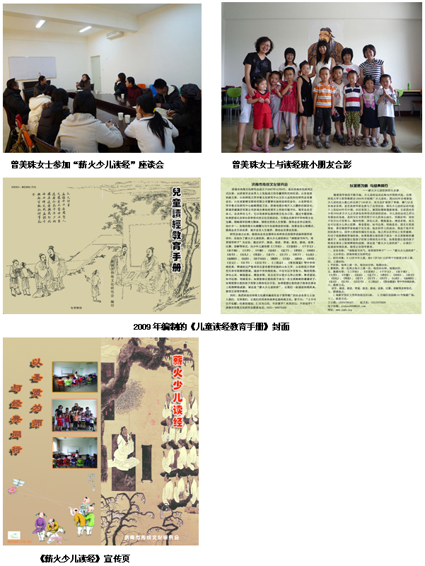 1、與山東師范大學(xué)齊魯文化研究中心合作舉辦薪火少兒讀經(jīng)班4期,并于08年12月7日特別邀請北京大學(xué)哲學(xué)系博士研究生曾美珠女士與讀經(jīng)班教師和家長在齊魯文化研究中心,就讀經(jīng)的方法以及讀經(jīng)過程中經(jīng)常遇到的問題等進行了座談與交流;同時雙方合作出版《齊魯文化》雜志共3期。