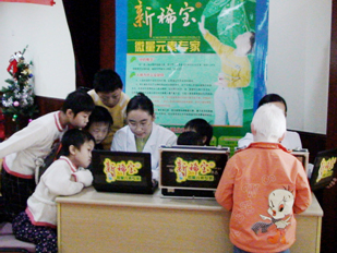 我企業(yè)董事長(zhǎng)湯傳忠先生與福利院兒童的合影 我企業(yè)員工正在為福利院兒童進(jìn)行微量元素檢測(cè)
