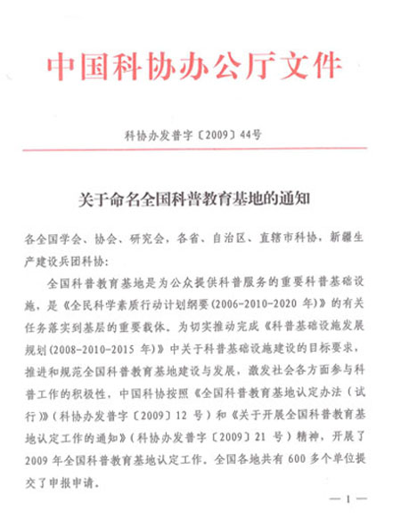 2009年9月,中國(guó)科協(xié)組織開(kāi)展了為期3個(gè)月的第一、二批全國(guó)科普教育基地綜合評(píng)估工作,我單位也積極遞交了全國(guó)科普教育基地的申請(qǐng)。經(jīng)全國(guó)學(xué)會(huì)、省級(jí)科協(xié)等推薦單位對(duì)本轄區(qū)、本系統(tǒng)全國(guó)科普教育基地的測(cè)評(píng),中國(guó)科協(xié)組織專(zhuān)家進(jìn)行了細(xì)致認(rèn)真的評(píng)審和抽查,全國(guó)僅認(rèn)定科普教育基地200多家。我單位以良好的硬件設(shè)施和突出的科普工作業(yè)績(jī)在數(shù)百家申報(bào)單位中脫穎而出,順利通過(guò)認(rèn)定,成為全國(guó)微量元素領(lǐng)域中唯一一家被國(guó)家科協(xié)命名的科普教育基地。