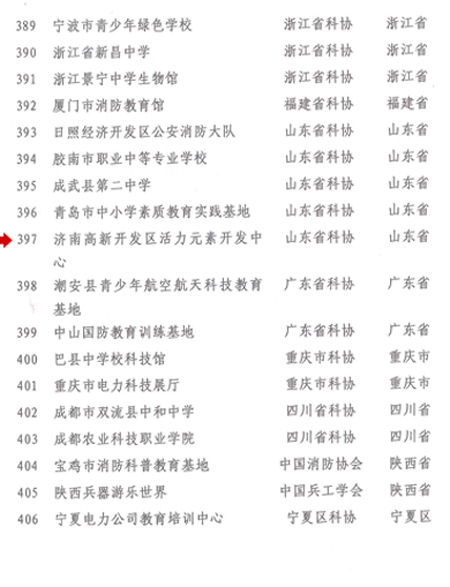 濟(jì)南高新開(kāi)發(fā)區(qū)活力元素開(kāi)發(fā)中心于2009年12月被中國(guó)科協(xié)命名為“全國(guó)科普教育基地”,這是繼2007年10月被山東省科協(xié)命名為“山東省科普教育基地”、2008年9月被濟(jì)南市科協(xié)命名為“濟(jì)南市科普教育基地”之后,獲得的又一項(xiàng)榮譽(yù)。
