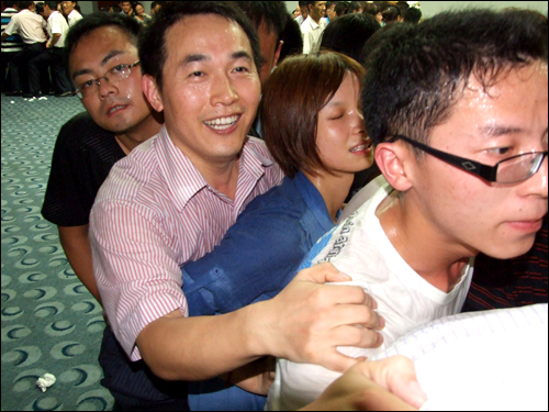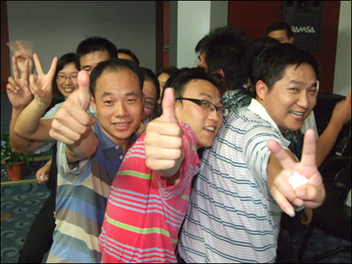 在講到“泛愛眾”這個(gè)章節(jié)時(shí),任老師與大家分享了一個(gè)“同甘共苦”的互動(dòng)游戲,他把現(xiàn)場人員分為12個(gè)組,每隊(duì)12至15人不等,大家并排站好,拼成一個(gè)緊湊的圓圈,每個(gè)隊(duì)員依次坐在后一位隊(duì)員的腿上,哪隊(duì)堅(jiān)持的時(shí)間長哪隊(duì)就獲勝。開始時(shí)大家還感覺很輕松,隨著時(shí)間一分一秒的過去,疼痛感漸漸襲來,大家開始感覺體力不支,這時(shí)會(huì)議室的空調(diào)也停止運(yùn)轉(zhuǎn),七月的濟(jì)南,正是最熱的時(shí)候,不一會(huì)兒,大家就大汗淋漓。