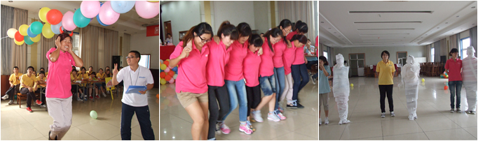 待裁判員宣讀完比賽規(guī)則后,大家都躍躍欲試,蓄勢待發(fā),活躍的氣氛到處可見。第一個項(xiàng)目是“輕松扎氣球”,要求各個方隊(duì)1名隊(duì)員參與比賽,身高限于1.6米以下的女生,參賽隊(duì)員將別有細(xì)針的發(fā)卡戴在頭上,聽到比賽口令后,用發(fā)卡頂球的方式將垂掛在天花板下方的氣球頂破,在規(guī)定的時間內(nèi),扎破氣球最多的獲勝。開始時,參賽隊(duì)員沒有充分掌握比賽技巧,發(fā)夾的細(xì)針沒有對準(zhǔn)氣球,跳了幾次不得要領(lǐng),周圍助威的同事,有不斷出點(diǎn)子的,有吶喊助威的,有總結(jié)別人經(jīng)驗(yàn)的,有加緊練習(xí)的,還有捧腹大笑的,場面很是熱鬧。參賽隊(duì)員經(jīng)過調(diào)整,順利、公平地比完了第一個項(xiàng)目。