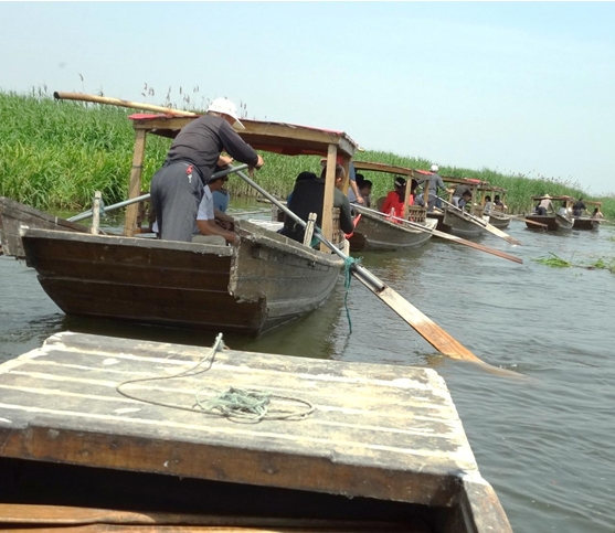 上午10:00,經(jīng)過2個(gè)多小時(shí)的路程我們到達(dá)本次旅游的目的地——東平湖。等大家依次從大巴車上下來時(shí),發(fā)現(xiàn)5位當(dāng)?shù)氐臐O民早已劃著小船等候在岸邊,伴隨著一首慷慨激昂的《好漢歌》,大家開始泛舟湖上,鮮紅的新稀寶大旗第一次飄揚(yáng)在廣闊的東平湖上。