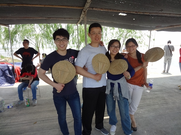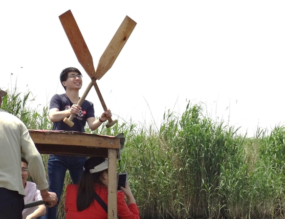 在豐盛的全魚宴之后,我們迎來了本次東平湖之游中最為有趣的項(xiàng)目——劃船比賽。比賽有4隊(duì)參賽,分別經(jīng)過初賽和決賽,最后決出總冠軍。為公平起見,每隊(duì)由3男2女組成,船家掌控方向,隊(duì)員負(fù)責(zé)劃槳,第一個(gè)到達(dá)終點(diǎn)的隊(duì)獲勝,在一聲嘹亮的號(hào)聲中兩隊(duì)出發(fā),岸邊隊(duì)友們擊鼓吶喊助威,隊(duì)員們個(gè)個(gè)奮力向前劃,木漿濺起的水花打到后面隊(duì)員的臉上、衣服上、眼鏡上,顧不了那么多了,只有使勁向前劃。這樣的場(chǎng)景可樂壞了撐船的船家,笑聲、加油聲、擊鼓聲、號(hào)子聲讓整個(gè)比賽異常激烈。兩輪比賽之后船家為獲勝團(tuán)隊(duì)頒發(fā)了東平湖紀(jì)念品——手編蘆葦扇,手編的小扇扇起了無限的清涼。