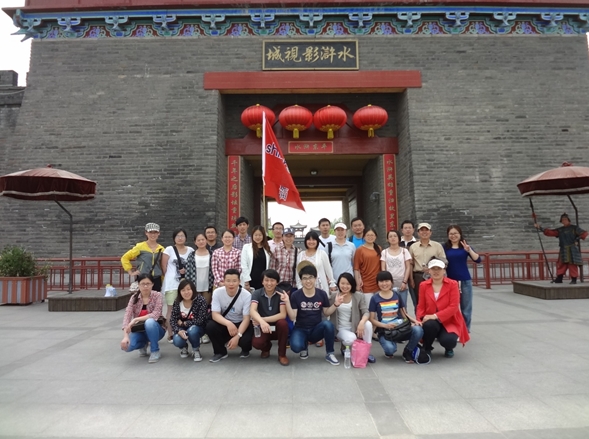 下午14:00,在泛舟東湖之后我們來到電視劇新版《水滸傳》的拍攝基地水滸影視城,在導(dǎo)帶領(lǐng)大家參觀了東平府、拜訪了武大郎家,路過了武大郎第一次遇到潘金蓮的二層小樓,觀賞了當(dāng)?shù)貞虬嘧颖硌莸穆短鞈蚯?,撞響了祈福鐘,就差一套古代的服裝了,否則我們是真真的穿越到了水滸古鎮(zhèn)。
