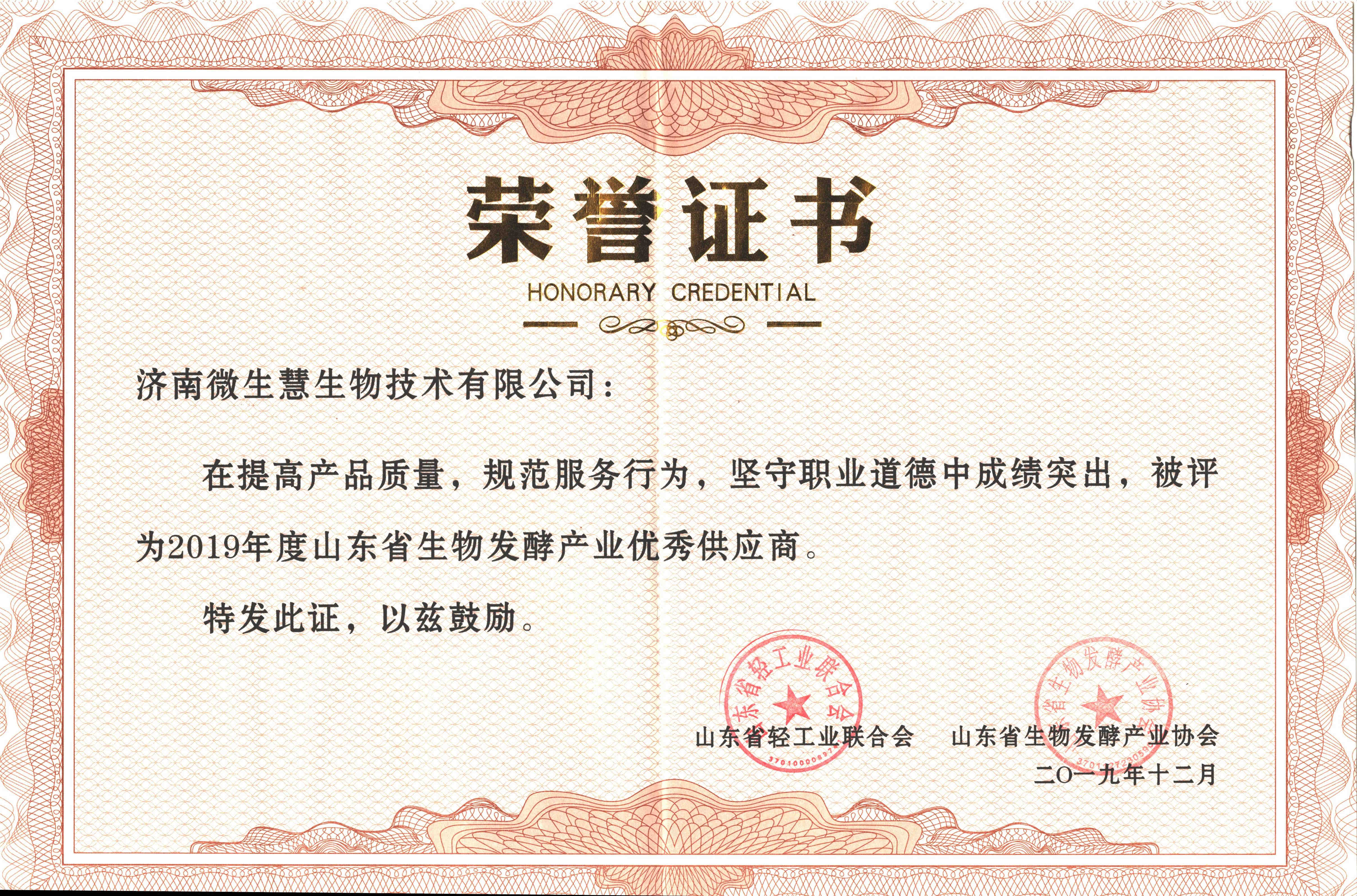2019年12月被山東省輕工業(yè)聯(lián)合會(huì)、山東省生物發(fā)酵產(chǎn)業(yè)協(xié)會(huì)評(píng)為